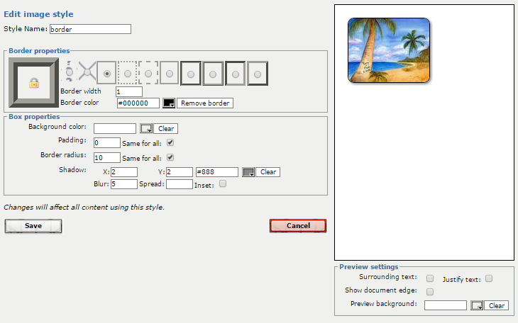 Easy to use content CSS style designer that allows editing font styles, heading styles, table styles, image border styles and text box (div, layer) styles within TinyMCE.