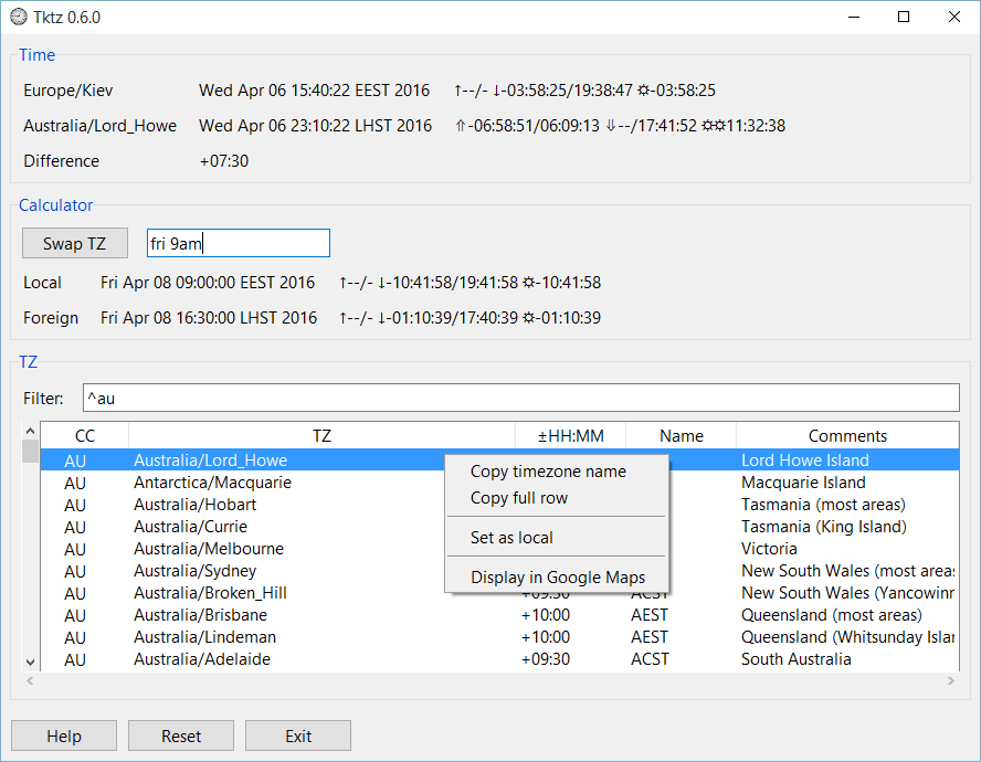 tktz displays the current time in 2 different timezones: local & foreign. You can convert an arbitrary local time, like “wed 2 pm” to a desired foreign timezone, filter the list of timezones, swap local/foreign zones, pinpoint a specific location on Google Maps, & view sunrise/sunset periods.