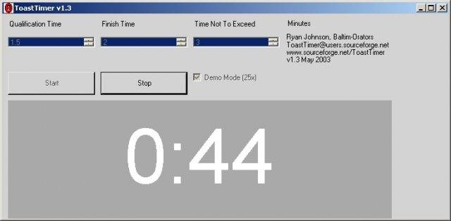 NEW VERSION - Pocket PC (Compact .Net Framework required)! Use your computer screen to tell you how long you've been giving a speech, compared to predefined limits, using a large on-screen clock, and a green/yellow/red background "stoplight" effect.