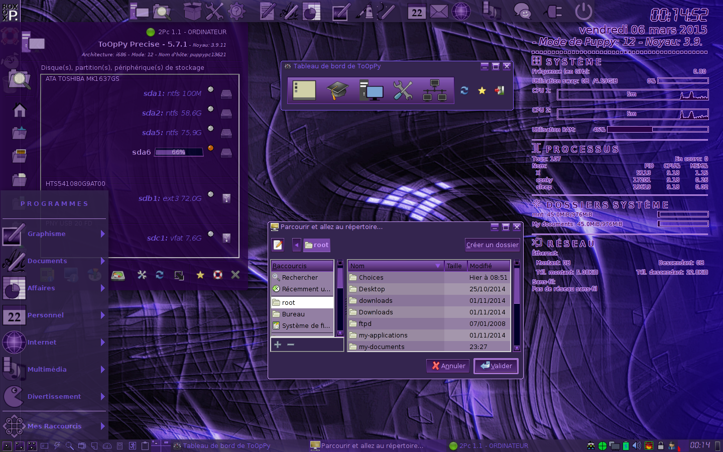 Hello puppy users ! ToOPpY is a good puppy os and the most beautifull one in the puppy land.It's not easy to master it, compared to non-puppy os.I love his ultra lightweight capacities on ressource.I hope a 2.5 version and his presence on the new puppy forum for users feedback.For example, disabaling update in firefox would be great because that causing starting probleme after this. Félicitations à Argolance pour cet OS. From a french guy. Ajout: après avoir fait le tour du puppyland, ToOpPy est vraiment unique en son genre.Les autres pupplets sortent du même moule.Il y a 2 ou 3 bugs mais rien de bloquant.Chapeau à Argolance pour ce travail formidable.