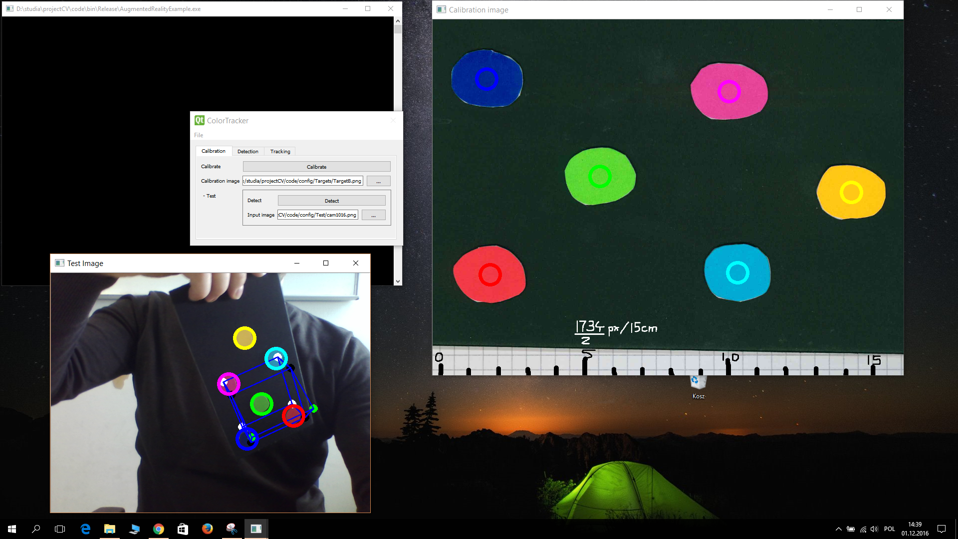 This is a project demonstrating tracking of a marker consisting of 6 blobs placed on a black palette and drawing a virtual house on it. Detection of the marker and augmentation (drawing of the house) are done in real time. Image from almost any internet camera can be used. The program is using incremental tracking, in which the position of the marker in the previous frame is used to improve the detection.
