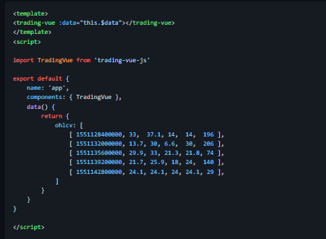 TradingVue.js was a hackable charting lib for traders. You could draw literally ANYTHING on top of candlestick charts. If you create trading software, this lib is probably for you. If you like to make custom indicators and think out of the box, this lib is most likely for you. And if you miss the usability of TradingView.com in other open-source libraries and can't stand it, you are definitely in the right place! The process of adding a new indicator is simple, first you define your own data format (should be timestamped though) and display settings. Customizable colors and fonts. Quite fast (works even with 3 mil candles). Scripts (make your own indicators). Simple API for making new overlays. Custom drawing tools. Non-time based charts (e.g. Renko).