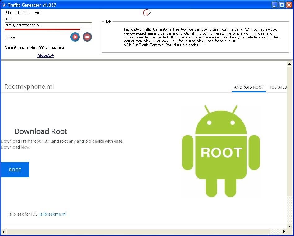 Traffic Generator is Free Software Developed By FrictionSoft. You Can Use It For Getting Solid Traffic To Your Website, Blog, Youtube Video (PS. use it for youtube only if video got more than 301 views), and for much more! Possibilitys are endless!