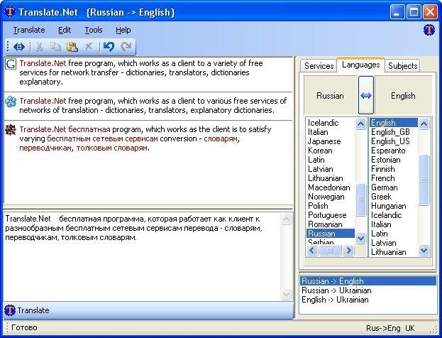 Client/aggregator for free online language services - translators, dictionaries, thesauruses . Allow to translate text over 41 sites, 53 services, 70 languages, more of 4000 translation directions.