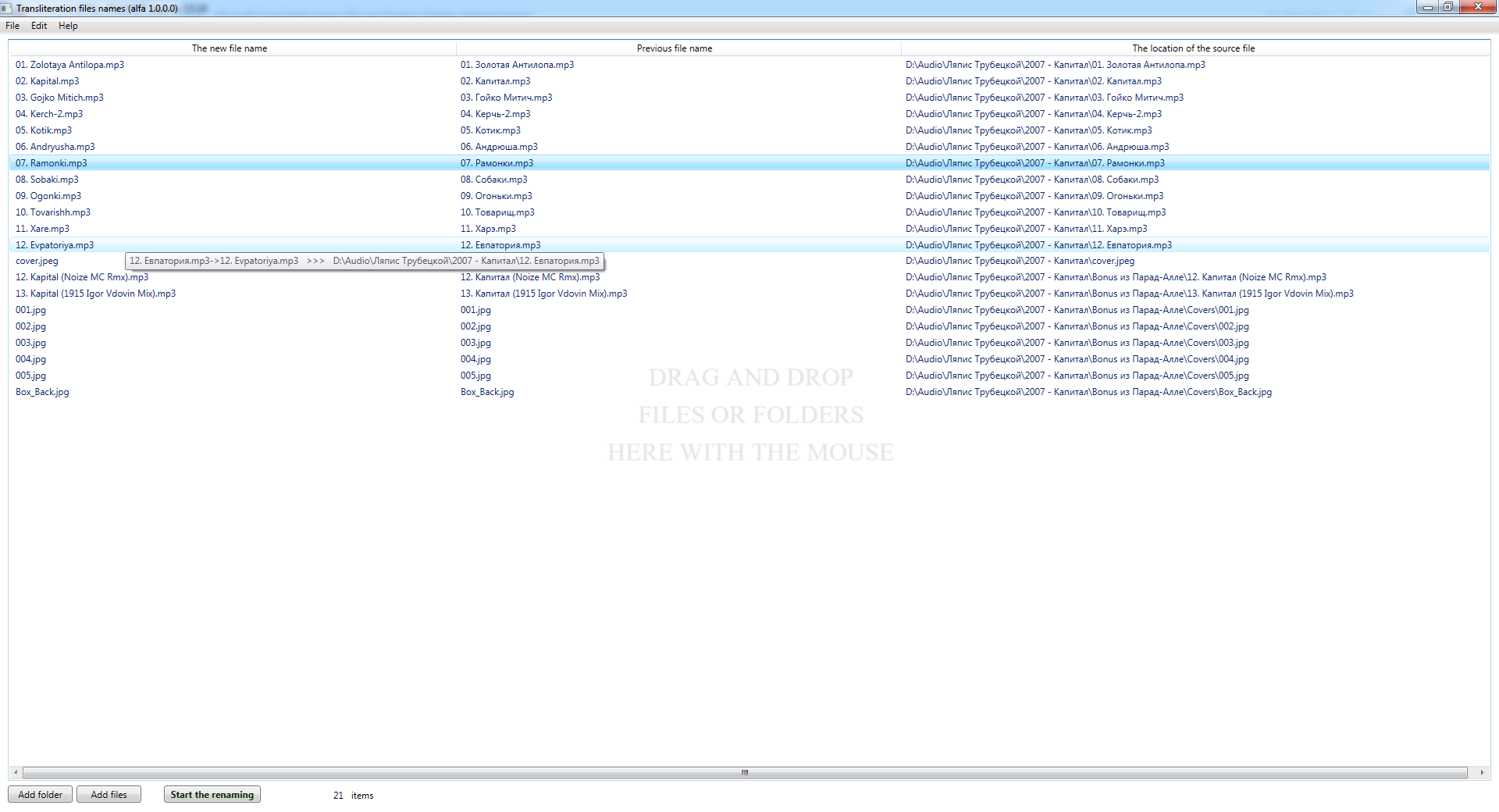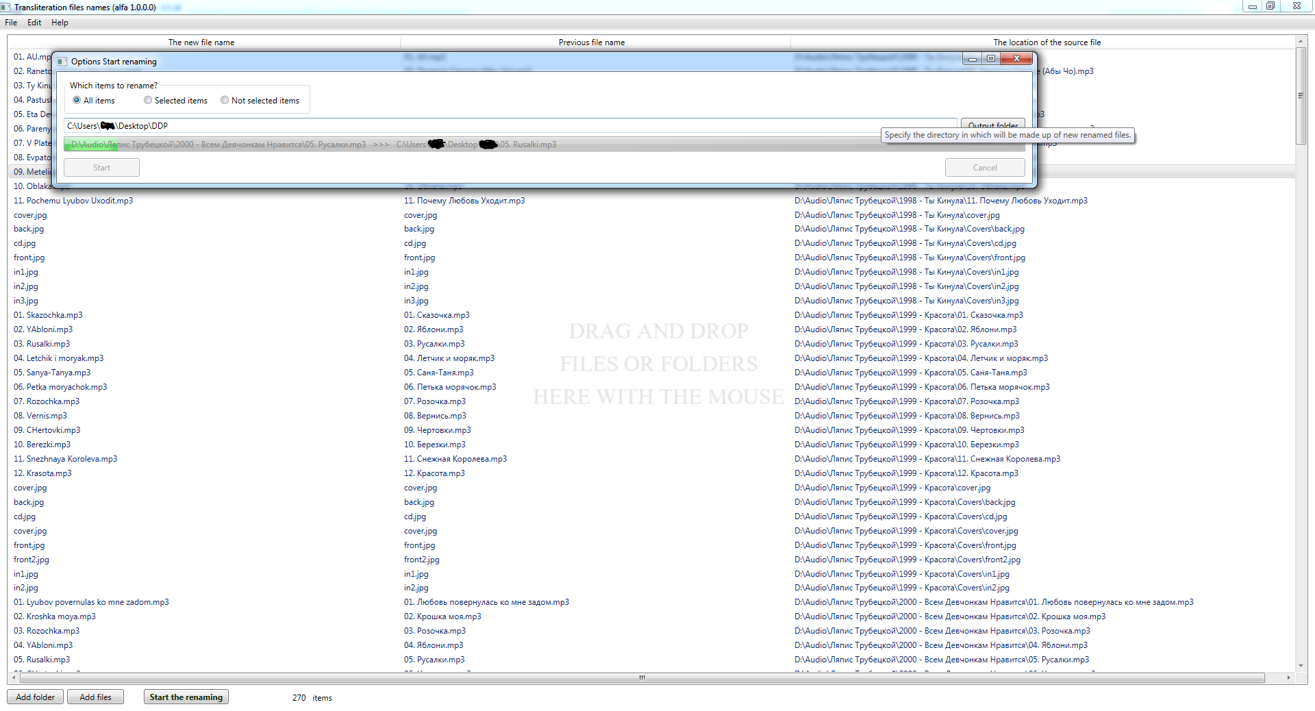 Программа предназначена для быстрого переименования большого количества файлов с кириллицы в латиницу (транслит) Cyrillic to Latina. Программа не переименовывает существующие файлы, а делает копии файлов в указанной вами папке.