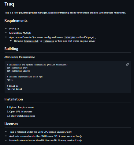 Traq is a PHP-powered project management and issue-tracking system designed for multi-project and milestone-driven workflows. It supports email notifications, custom fields, and per-project permissions. Ideal for teams wanting a simple, self-hosted tool, it runs on PHP 8.1+ with MariaDB/MySQL