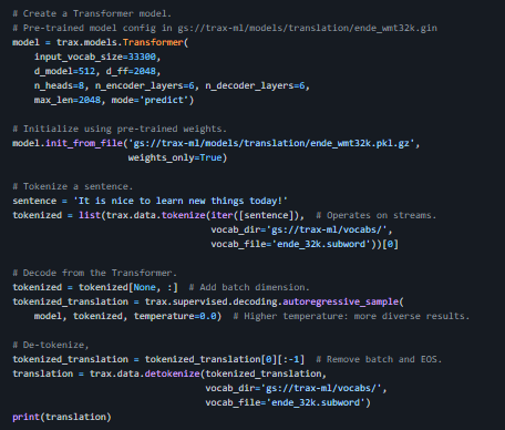Trax is an end-to-end library for deep learning that focuses on clear code and speed. It is actively used and maintained in the Google Brain team. Run a pre-trained Transformer, create a translator in a few lines of code. Features and resources, API docs, where to talk to us, how to open an issue and more. Walkthrough, how Trax works, how to make new models and train on your own data. Trax includes basic models (like ResNet, LSTM, Transformer) and RL algorithms (like REINFORCE, A2C, PPO). It is also actively used for research and includes new models like the Reformer and new RL algorithms like AWR. Trax has bindings to a large number of deep learning datasets, including Tensor2Tensor and TensorFlow datasets. You can use Trax either as a library from your own python scripts and notebooks or as a binary from the shell, which can be more convenient for training large models. It runs without any changes on CPUs, GPUs and TPUs.