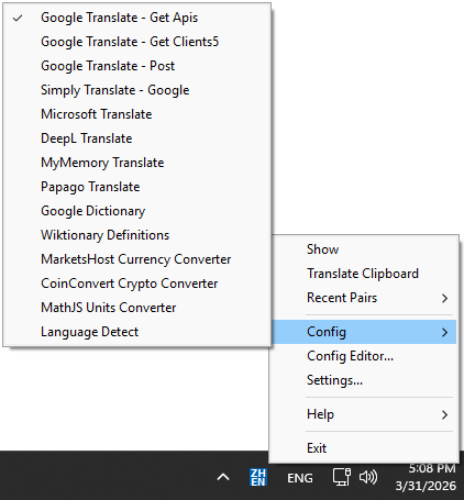 Trayslate is a tray-based client for translation services. You can enter text directly, translate clipboard content, or translate selected text in any application. You can also replace text in another app with its translation using a hotkey. The app lets you choose and fully configure the translation service you use.