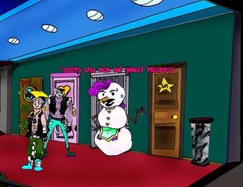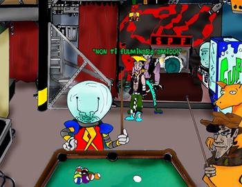 T-Rex and Muscle Sam: Big Trouble in Smashing Potatoes Federation is an adventure game with a classic point-and-click interface. It uses a verbcoin-system for the interaction. When a character or an object is clicked, a coin interface appears with the actions "talk", "use" and "look". The game was a pilot for a comic series on the wrestling world. The supported languages are English and Italian.