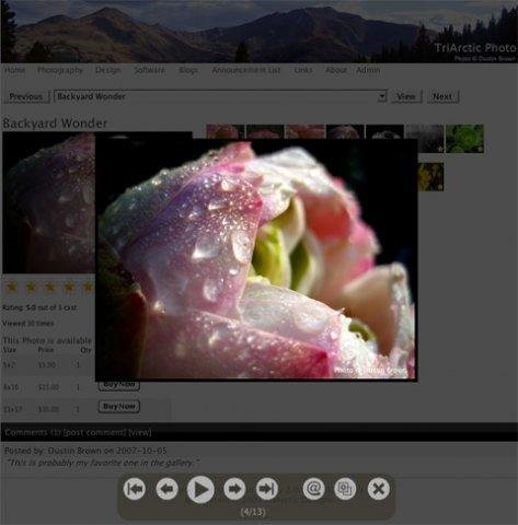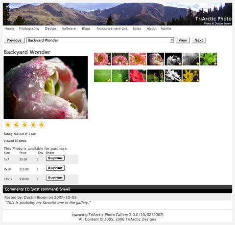 TriArctic Photo Gallery is a Java based, AJAX enabled, online photo album. Viewers can rate photos and leave comments. Admin tools include: web based album upload/creation, thumbnail scaling, and statistics. Paypal integration provides photo sales.