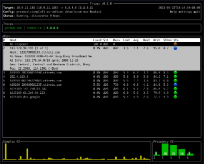 Trippy combines the functionality of traceroute and ping and is designed to assist with the analysis of networking issues. Trace multiple targets simultaneously from a single instance of Trippy. Per hop stats (sent, received, loss%, last, avg, best, worst, stddev, jitter & status) Per hop round-trip-time (RTT) history and frequency distributing charts. Interactive chart of RTT for all hops in a trace with zooming capability. Interactive GeoIp world map. Isolate and filter by individual tracing flows. Customizable color theme & key bindings. Customizable column order and visibility. Configuration via both command line arguments and a configuration file. Show multiple hosts per hop with ability to cap display to N hosts and show frequency %. Show hop details and navigate hosts within each hop. Freeze/unfreeze the Tui, reset the stats, flush the cache, and preserve the screen on exit. ¿