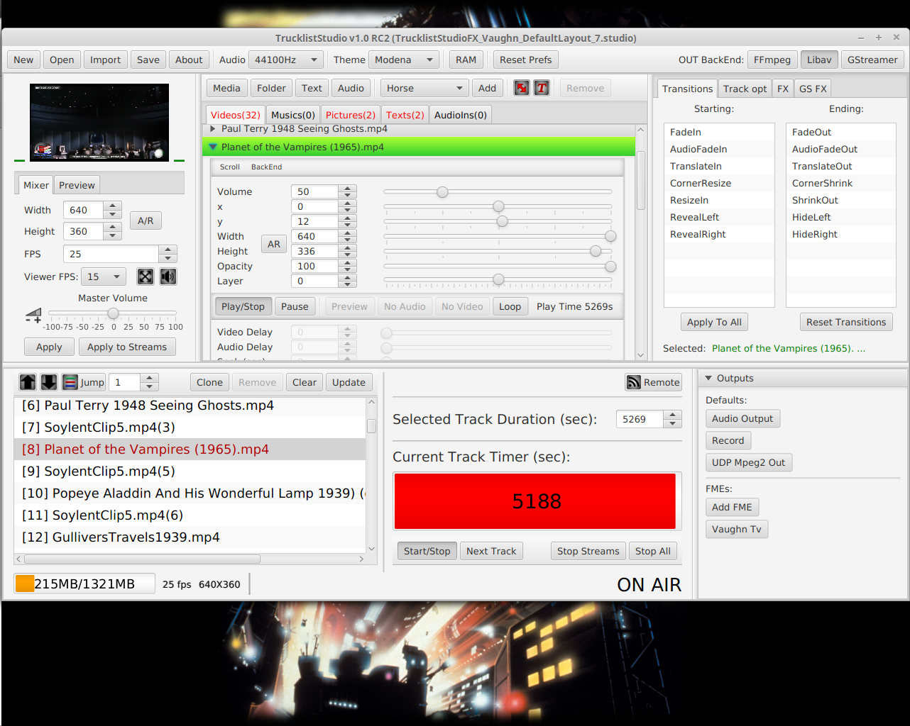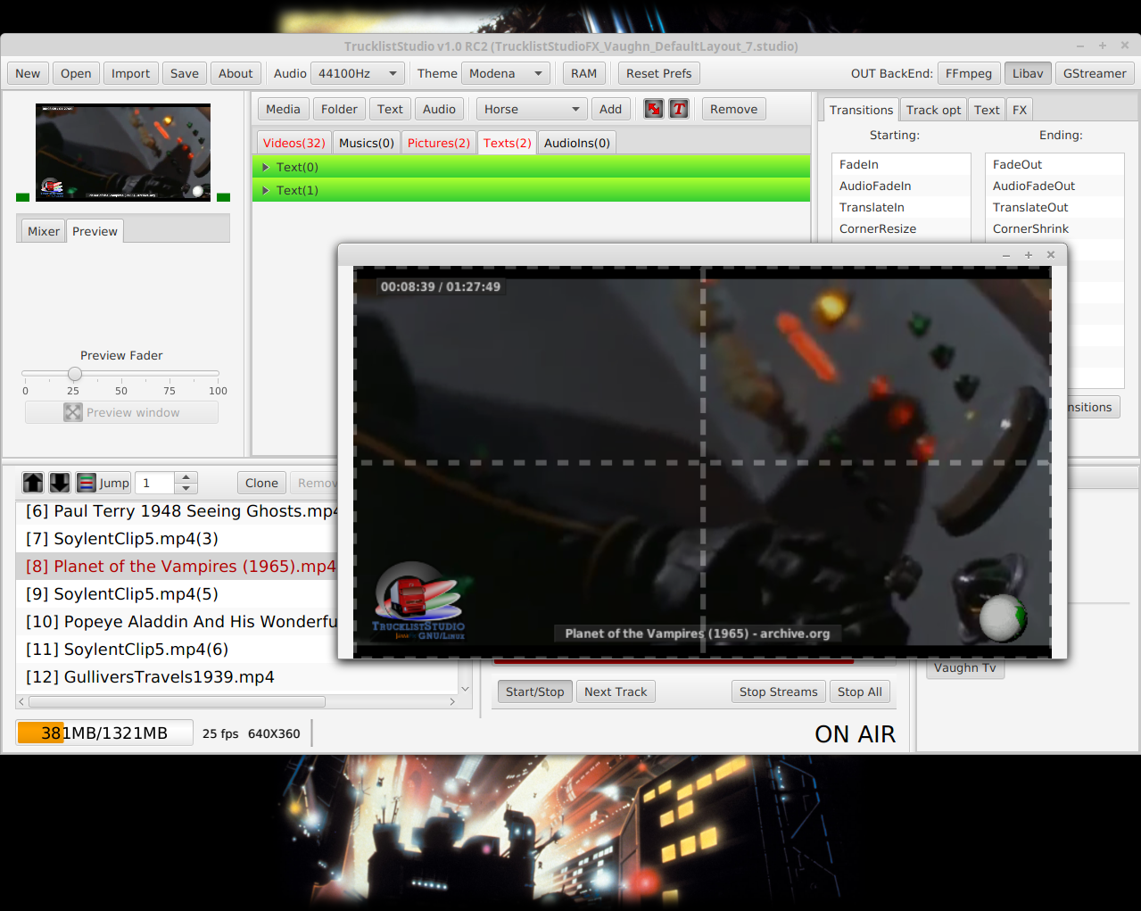 TrucklistStudioFX is the JavaFX version of TrucklistStudio. It is only capable to handle Videos, Music, Picture, Desktop capture and Text/Animated-Gifs Overlays. It can Broadcast to almost every kind of services through FMEs XML configuration files.