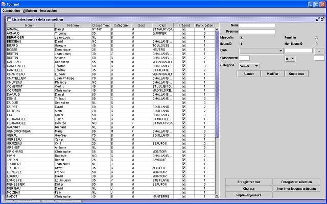 WARNING. 1) Under Linux, the launcher has to be modified. The proposed run.bat is javaw -classpath lib/log4j-1.2.8.jar;lib/crimson.jar;lib/jaxp.jar;lib/myUtils.jar;lib/jconfig.jar;lib/sax.jar;lib/jmxri.jar;jar/tournoi.jar tournoi.xml.XMLAnalyzer It works only under Windows (javaw does not exist under Linux, and ";" has to be replaced by " :") So, under Linux, this one works: java -classpath lib/log4j-1.2.8.jar:lib/crimson.jar:lib/jaxp.jar:lib/myUtils.jar:lib/jconfig.jar:lib/sax.jar:lib/jmxri.jar:jar/tournoi.jar tournoi.xml.XMLAnalyzer Do not forget to modify the permissions of all .jar files, so that they are "executable" (the installation process does not do it automatically). You can save it into a file, say runLinux.bat, and the command line is then sh runLinux.bat Of course, you can then create a launcher that contains this command line. ---------------- 2) For each player, the system proposes to use one of two rates: according to the "old" system (say 65), or to the "new" one (say 1000). However: - the old one is indeed old (more than ten years). A lot of young players are not even aware of it. It could be easily removed here (and IMO it should) - even if you use the new (current) one, the system computes an equivalence (1000 =>65), and, more annoying, this is the old (65) one that is printed along to the name of each player. 3) At least under Linux (Ubuntu), I have not been able to display the nice "tree" of the competition, only a rectangular table. It works, however, with just a small bug (the window for the scoring partly appears _on_ this table, but everthing is OK on the Match page).