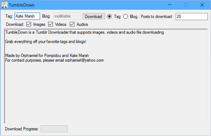 TumbleDown is a Tumblr Downloader written in C# that grabs all the image/video/audio files from a blog/tag.