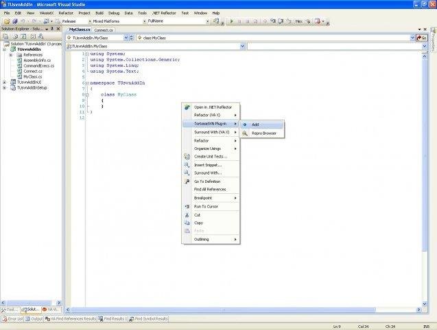 TUsvnAddIn (svn) is a free open source TortoiseSVN add-in for visual studio. TUsvnAddIn allows developers to use some of the TortoiseSVN features over Visual Studio 2005/2008/2010. Users may also use the code as reference as they please.