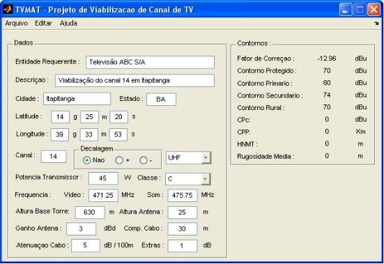 Aplicativo para auxílio na elaboração de projetos de viabilização de canais de TV. Baseado na regulamentação nº284 de 7 de dezembro de 2001. Aplicação desenvolvida em MatLab. Utiliza o método da interpolação para estimar os valores das curvas de intensidade de campo, utilizadas nos cálculos. Aplicação destinada a estudantes do curso de engenharia de telecomunicações.