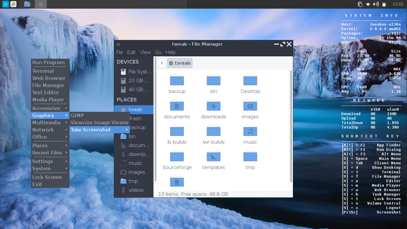 Tweakos yeni bir dağıtım olmasına rağmen bana göre oldukça kararlı ve kullanışlı geldi. Kurulum ve kullanımda herhangi bir sorun yaşamadım. Sistemi gayet minumum düzeyde kullanıyor. Uzun kullanımlarda, video ve oyunlarda performanstan düşmüyor, performansı çok iyi. Yıllardır Debian stable kullanan biri olarak Tweakos dağıtımını çok begendim. Geliştiriciye teşekkür ediyor ve Tweakos stable üzerinde devam etmesini bekliyorum... Although Tweakos is a new distribution, it seems to me fairly stable and useful. I did not experience any problems during installation and use. He uses the system at a very minimal level. In long use, performance and performance do not fall in video and games, performance is very good. I have been very pleased with the distribution of Tweakos as someone who has been using Debian stable for years. I thank the developer and expect to continue on Tweakos stable...