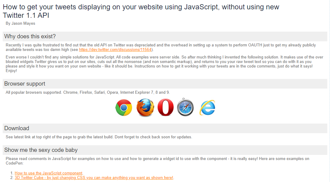 Allows you to get your tweets displayed on your website using JavaScript, without using new Twitter 1.1 API. Recently I was quite frustrated to find out that the old API on Twitter was depreciated and the overhead in setting up a system to perform OAUTH just to get my already publicly available tweets was too damn high. Even worse I couldn't find any simple solutions for JavaScript. All code examples were server-side. So after much thinking, I invented the following solution. It makes use of the over-bloated widgets Twitter gives us to put on our sites, cuts out all the nonsense (and nonsemantic markup), and returns to you your raw tweet text so you can do with it as you please and style it how you want on your own website - like it should be. Instructions on how to get it working with your tweets are in the code comments, just do what it says! Enjoy!