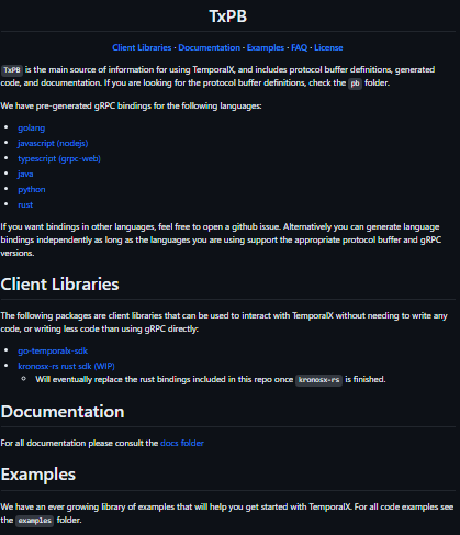 - TxPB provides client libraries that allow users to interact with TemporalX without the need to write extensive code. These libraries simplify the process of using TemporalX functionality