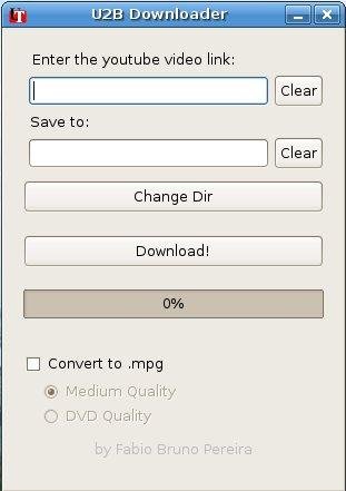 U2B Downloader is a lightweight GUI software to download videos from youtube.com and metacafe.com in flash video format (flv) and optionally convert them to mpeg. It's fast and simple to use.