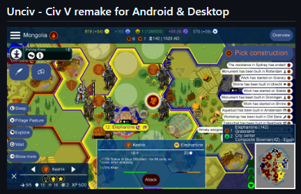 Unciv is an open-source reimplementation of the game Civilization V in Java using LibGDX. It focuses on replicating the core gameplay mechanics in a lightweight, mobile- and desktop-friendly format, supporting both single-player and multiplayer modes. Unciv uses a minimalist art style and text-based UI to deliver a fast, turn-based strategy experience.
