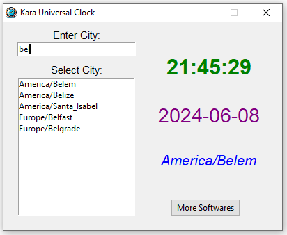 a simple Windows software called Kara Universal Clock. Using this program, you can see the current date and time of that city by typing the first letters of the desired city and selecting that city from the list.