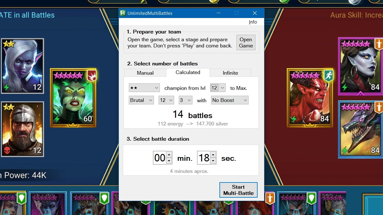 You get unlimited auto battles and information about energy cost and silver earned. It can be used on background while you do other things with your PC.
