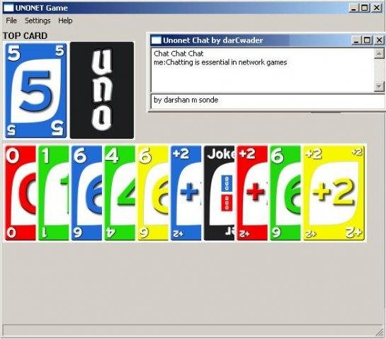 unonet is program for playing uno card game online.this is written in C++ and has network play.you can play against many players over internet and is completely free.