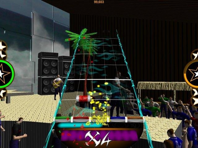 This is an open source music-rhythm game designed to make use of the "Rock Band" peripherals.