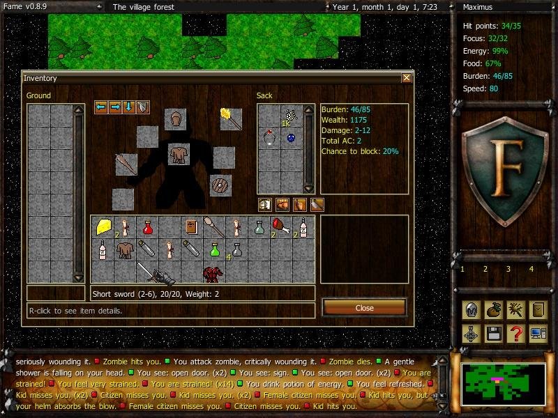 The game is inspired mainly by ADOM, but it also incorporates a lot of original ideas. It's not completed yet (though fully playable), but is developed actively and gets improved every day. Not only you can play it, you are also able to create your own locations with a built-in editor and custom quests with a dedicated scripting language.
