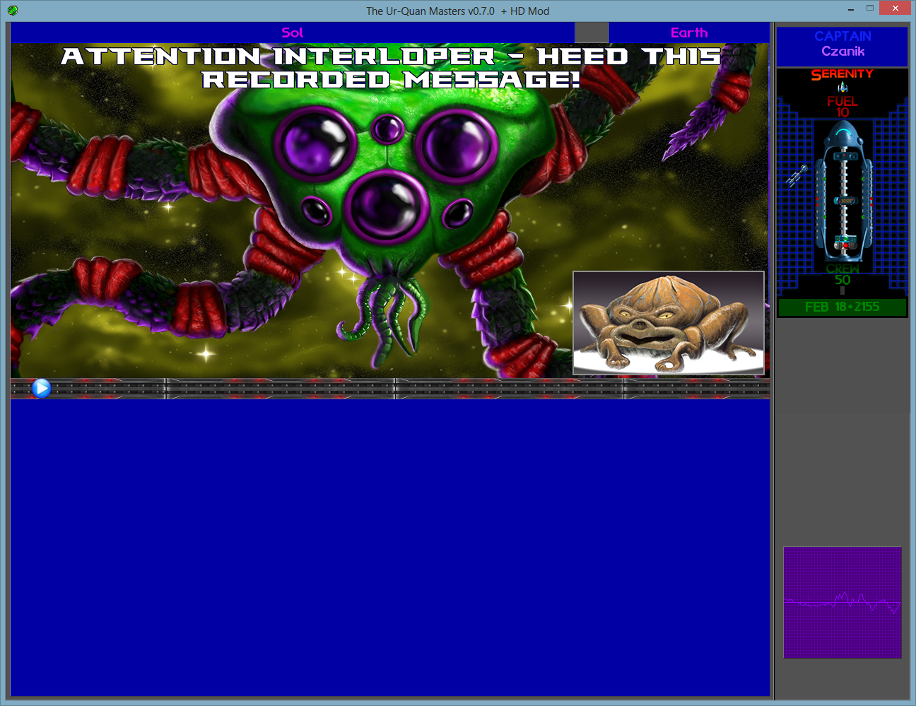 This is what shows on the opening screen of the game I am playing: -Ur-Quan Masters HD v0.7.0+HD Mod BETA-SVNr1338 I have been really loving this game. Never played the original Star Control 2 but observed some of it--enough to know that Ur-Quan Masters HD is the best to play. But sadly, and the reason I give it a design value of 1 instead of 5 and a 1-star rating instead of 5-star, is because of a SAVE GAME glitch. I've been playing the game for many hours and am guessing I am halfway through it. When I attempt to SAVE, I get kicked out of the game and the SAVE slot is left empty. This game-destroying glitch is the only one I noticed for all my hours of play. If there is an Arilou game technician out there receiving this message, HELP this hapless human, PLEASE. By helping me, you will be helping all the other hapless humans who start this game not knowing the hideous SAVE bug waiting to chew them up.