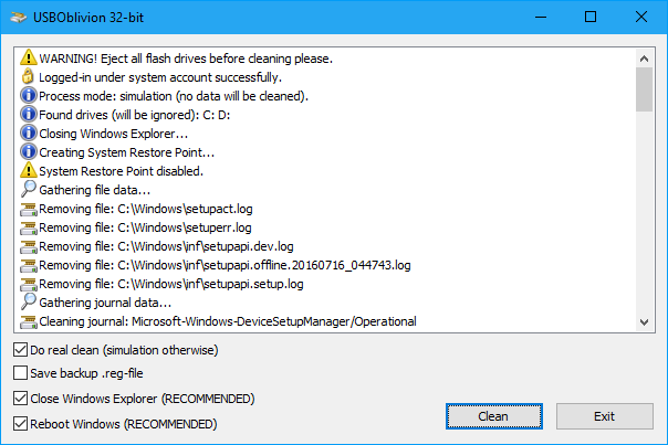 This utility designed to erase all traces of (broken) connected USB devices - flash-drives, disks and CD-ROMs from computer registry of Windows XP, Windows 2003, Windows Vista, Windows 7, Windows 8, Windows 10 (32/64-bit versions). The utility has a test mode of operation, i.e. without actually removing data from the registry, and, just in case, creates a .reg-file to undo any changes. There is also a fully automatic mode.