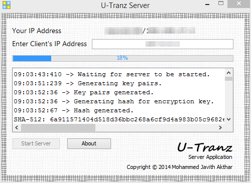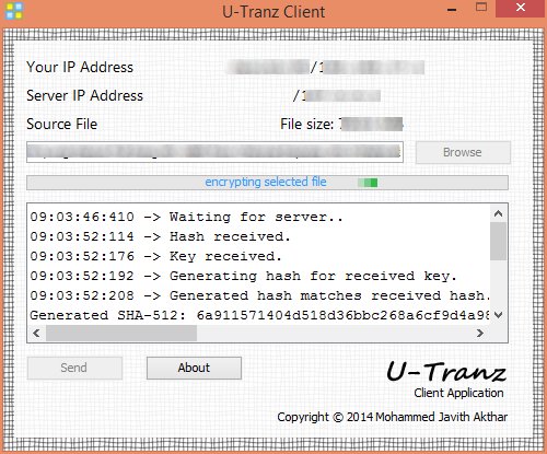 U-Tranz is a free application developed on the characteristics of UDP allows the transmission of unlimited file size. Most of the applications based on UDP restrict file sharing upto 64kb which makes transmission less efficient on large files. Along with the tremendous increase in file size, certain features like implementation of Government Standard Security Algorithms (AES-256*/RSA-2048 and SHA-512) have been added to this application for secure sharing of huge files across different workstations.This tool programmed in JAVA and requires Java Runtime Environment to use this tool.