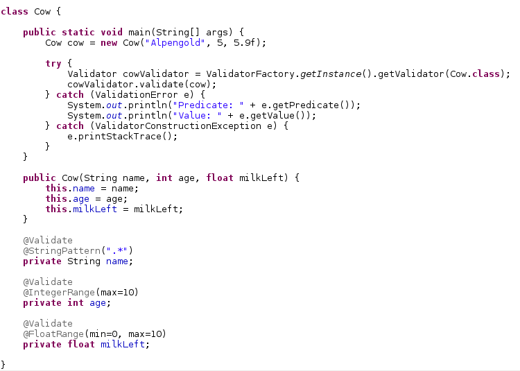With use of annotations Validity can validate java beans with minimal amount of code. This library is meant to be easy to use and clear to understand. If You find it useful please leave a comment. Additional requests will also be taken into account in future versions.