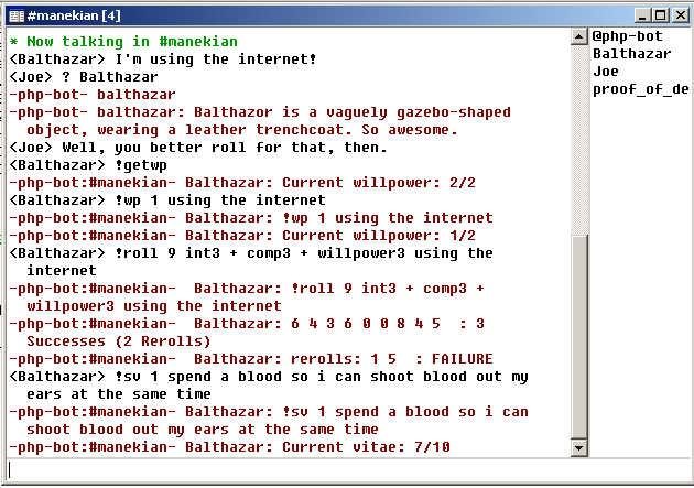 This Project provides modules for php-irc bot and php-nuke to run an IRC based NWoD Vampire game, with character sheets handled in php-nuke. The package shown here was previously used to run the "Vampire the Rebirth" irc setting.