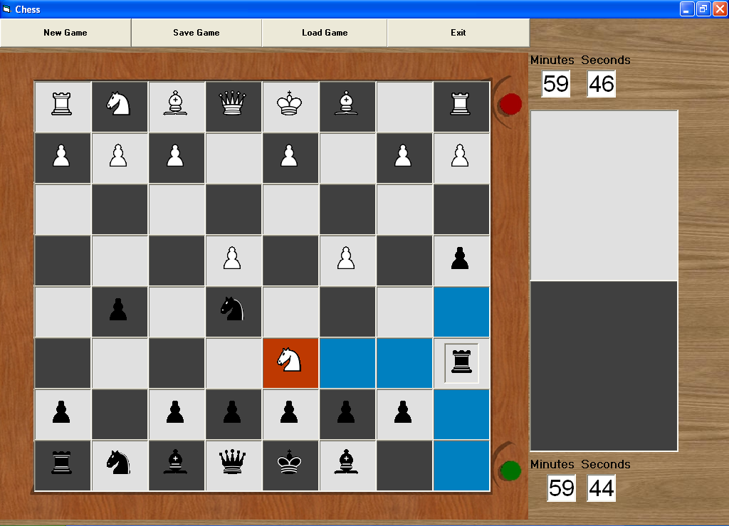 Simple Human vs Human Chess game implemented in Visual Basic 6. Enforces international Chess rule-set ... correct moves for all pieces, pawn promotion, timed games and the ability to save and load games during play.
