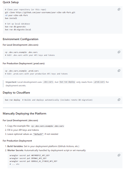 VibeSDK is an open source “vibe coding” platform. VibeSDK is a project built by Cloudflare. It provides a full-stack reference implementation of an AI-driven system. Users describe the application they want in natural language, and the system generates, previews, and deploys the resulting web app. It uses Cloudflare’s infrastructure (Workers, Containers, sandboxes). It can run untrusted code safely, provide live previews, and deploy apps at scale. VibeSDK gives you the exact methodology, tools, and confidence to turn your ideas into revenue-generating products, faster than you thought possible. Live preview of generated apps in isolated sandbox containers. Support for React + TypeScript + Tailwind generation, backend routing, and modern web stack scaffolding.