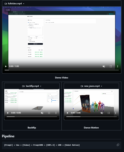 video2robot is an end-to-end open-source pipeline that converts generative video or prompt-driven motion content into executable humanoid robot motion sequences, enabling researchers and developers to go from high-level action descriptions or videos to robot-ready motion data. The pipeline supports both prompt-to-video generation using models like Veo/Sora and video upload processing, followed by human pose extraction through a 3D pose model and retargeting of that motion to robot joints using a general motion retargeting system. This workflow allows users to generate robot motion files that specify joint angles, root positions, and orientations that can be deployed on supported robot platforms (e.g., Unitree models). Video2robot includes scripts for each stage of the pipeline (generation, extraction, conversion, visualization) and can run as a CLI or through a basic web UI.