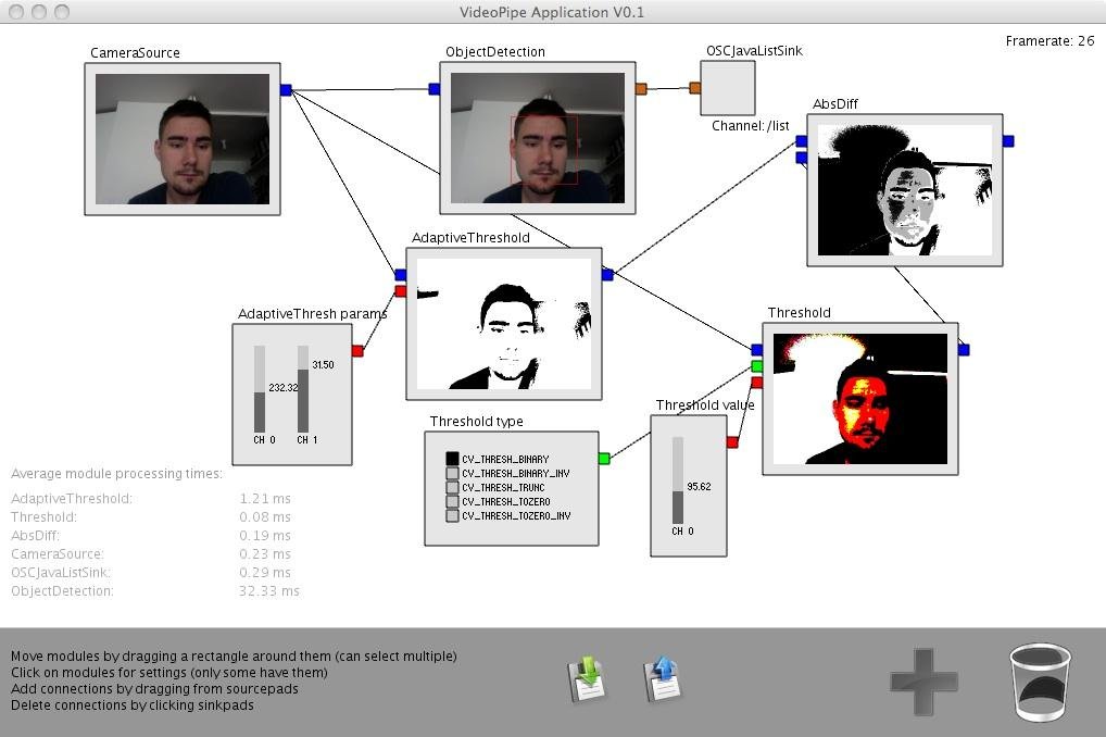VideoPipe is an application that allows a user to visually connect and manipulate videoprocessing modules to create a realtime procedural and configurable processing pipeline for video streams. It allows the user to experiment in an intuitive way with processing modules and tweak their parameters while the system is running, making the development and prototyping of video processing pipelines faster and easier.