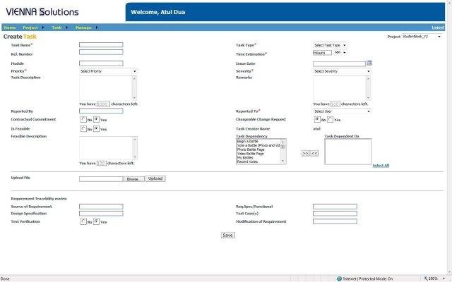 VIENNAPMS is a Project Management System for Software Development Projects in .Net & MySQL. It covers WBS, Task Approval, Assignments, File Upload, Time Recording, Status Reports, Bug Recording, SRTM, Rework Reports, Dev. vs Test Time, Bugs Ratio, etc.