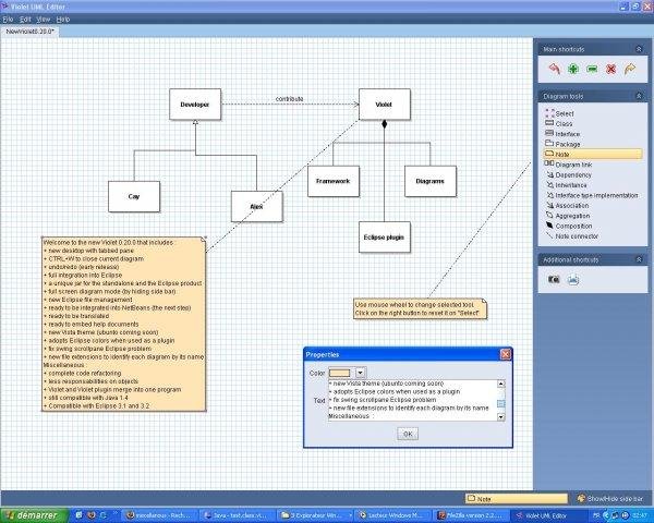 Violet UML Editor is a powerfull modeling software, easy to use, ready to work by Cay Horstmann. It draws nice-looking class, sequence, state, object and use-case diagrams. This plugin embeds Violet into Eclipse. SEE A FLASH DEMO ON MY HOMEPAGE.