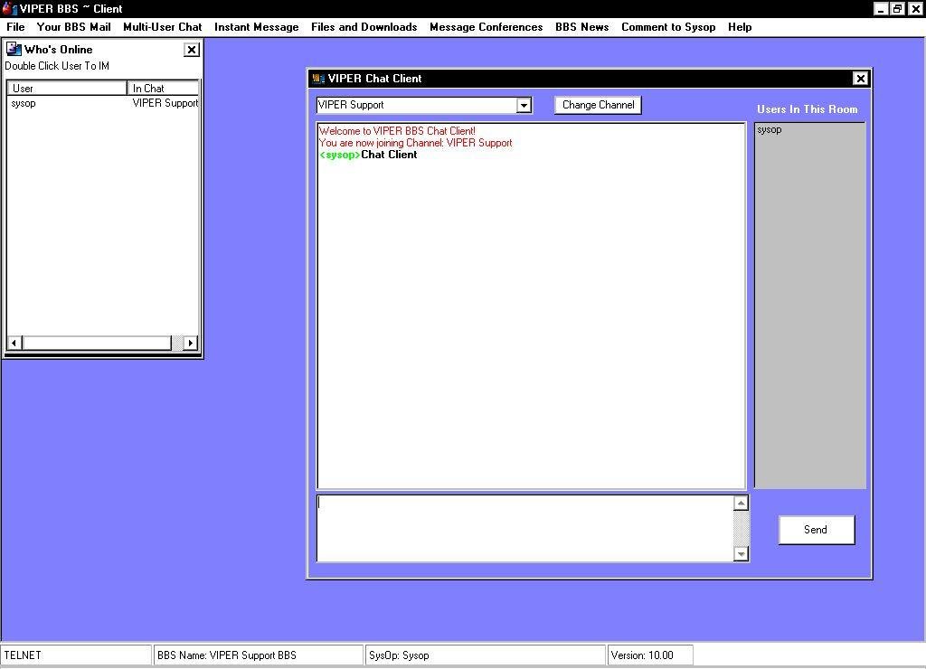 Viper BBS Software for Windows enables SysOps to setup BBS (Bulletin Board System) in minutes, with Online Files, Messaging, Conferencing, Chat, IM, and More, why pay hundreds or thousands for BBS Software from the other guys Viper is FREE of Charge and provides Internet Connectivity (Web, Mail, Telnet, etc) and is a step into the 20th century for the legacy BBS System!