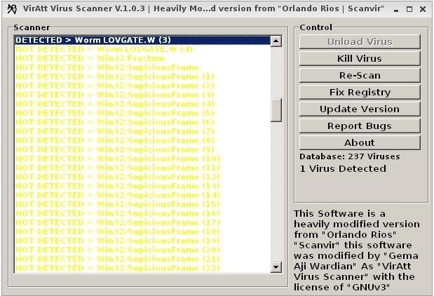 This program is a scanner that helps detect and delete virus such as "MyDoom, Sasser, etc", created with custom engine developed by VirAtt Viruslab this program fastly detect, delete, and destroy process file of the virus itself including fixing registry error caused by the virus.