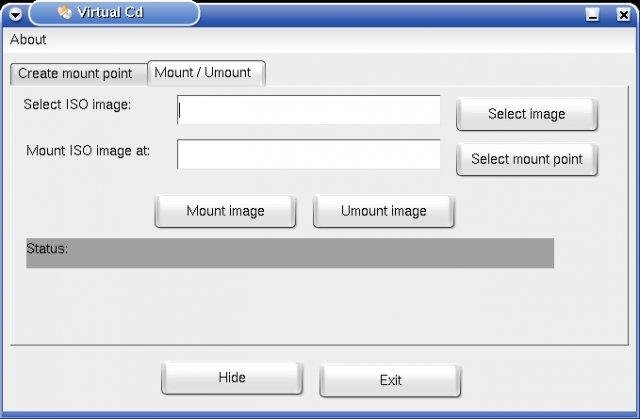 This small program mounts and unmounts cd images from/to your file system from/to a specific mount point. Supports the CD-ROM image types img, bin, mdf and nrg. It is written in Gambas