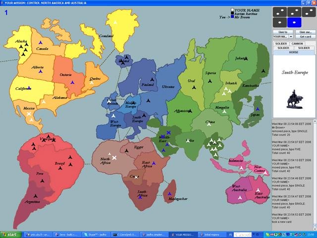 A Java based virtual Risk-board for internet playing for 2 - 5 players. Contains a client/server UI applet (can also be started as a local application). Includes game saving. Requires a third party chat program for keeping contact with other players.