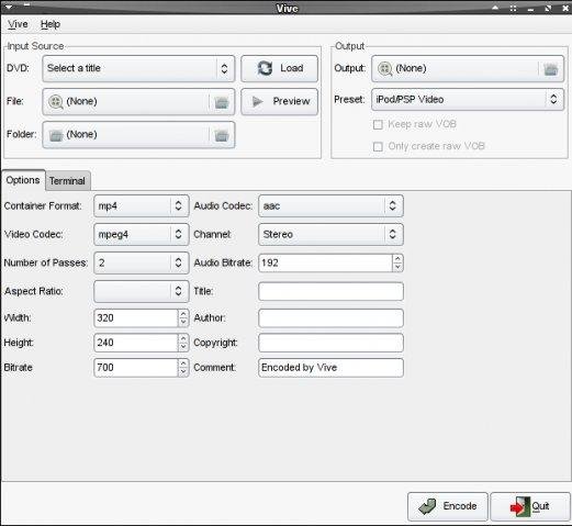 An ffmpeg GUI for video encoding. Supports DVD and files and converts to all formats allowed by ffmpeg, including the iPod, PSP, and other popular formats.