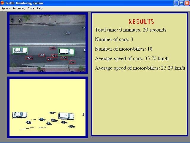 Solving problems of counting the number of vehicles passing on a road during an interval time, as well as the problems of vehicles classification and estimating the speed of the observed traffic flow from traffic scenes acquired by a camera in real-time.