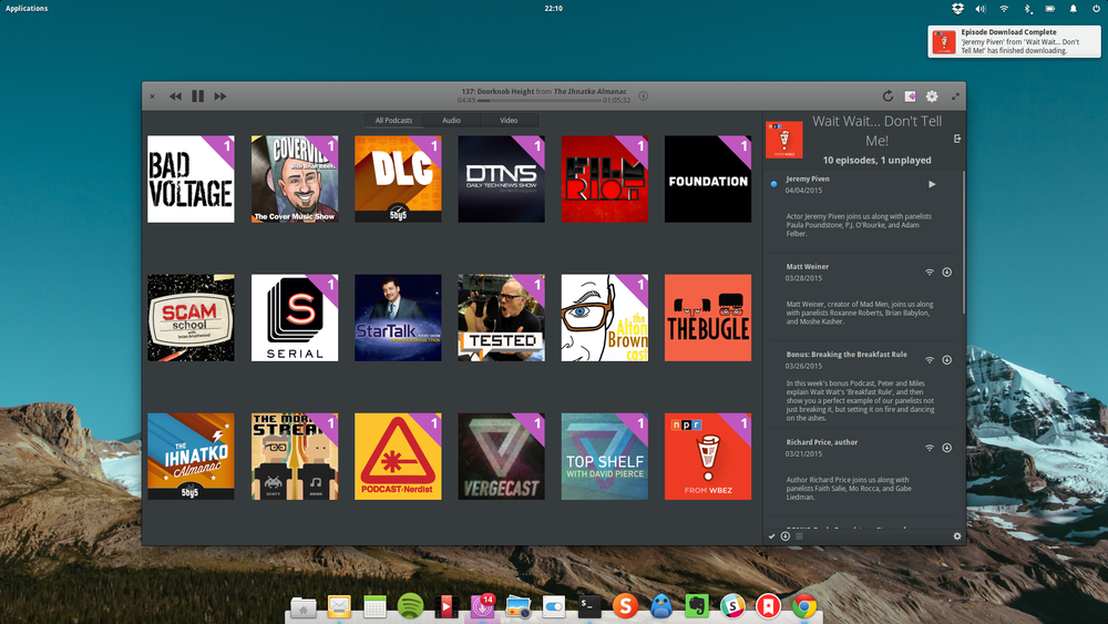 A beautiful and easy to use podcast app designed for elementary OS and other GTK-based Linux desktops. Includes a built-in video player, automatic updating, smart library management, library importing and exporting, custom skip intervals, and more!