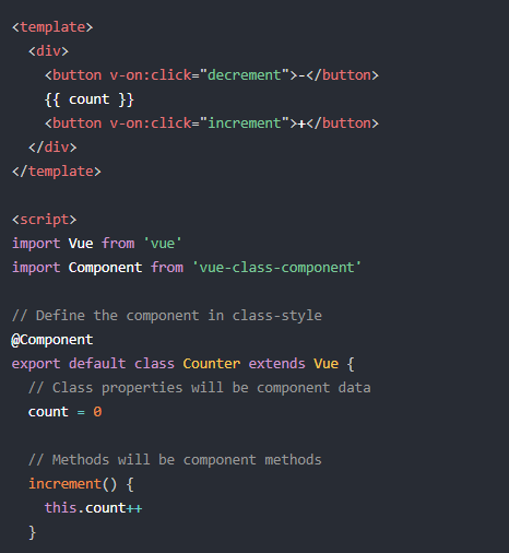 Vue Class Component is a library that lets you make your Vue components in class-style syntax. You can define component data and methods in the intuitive and standard class syntax by annotating the class with the @Component decorator. You can simply replace your component definition with a class-style component as it is equivalent with the ordinary options object style of component definition. By defining your component in class-style, you not only change the syntax but also can utilize some ECMAScript language features such as class inheritance and decorators. Vue Class Component also provides a mixins helper for mixin inheritance, and a createDecorator function to create your own decorators easily.