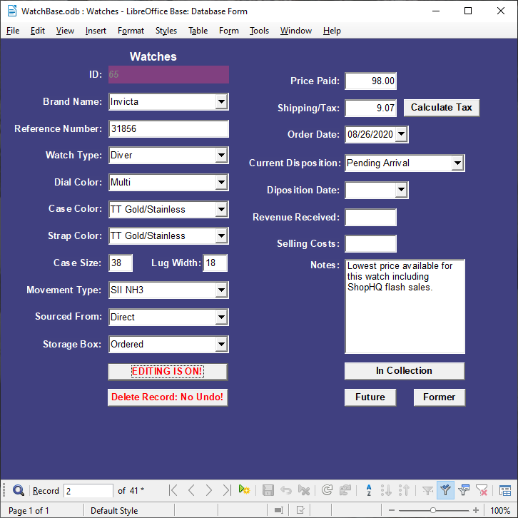 A database catalog application for watch collectors. Maintain an inventory of watches. Allocate watches to future purchase, in collection, and disposed of or sold categories.